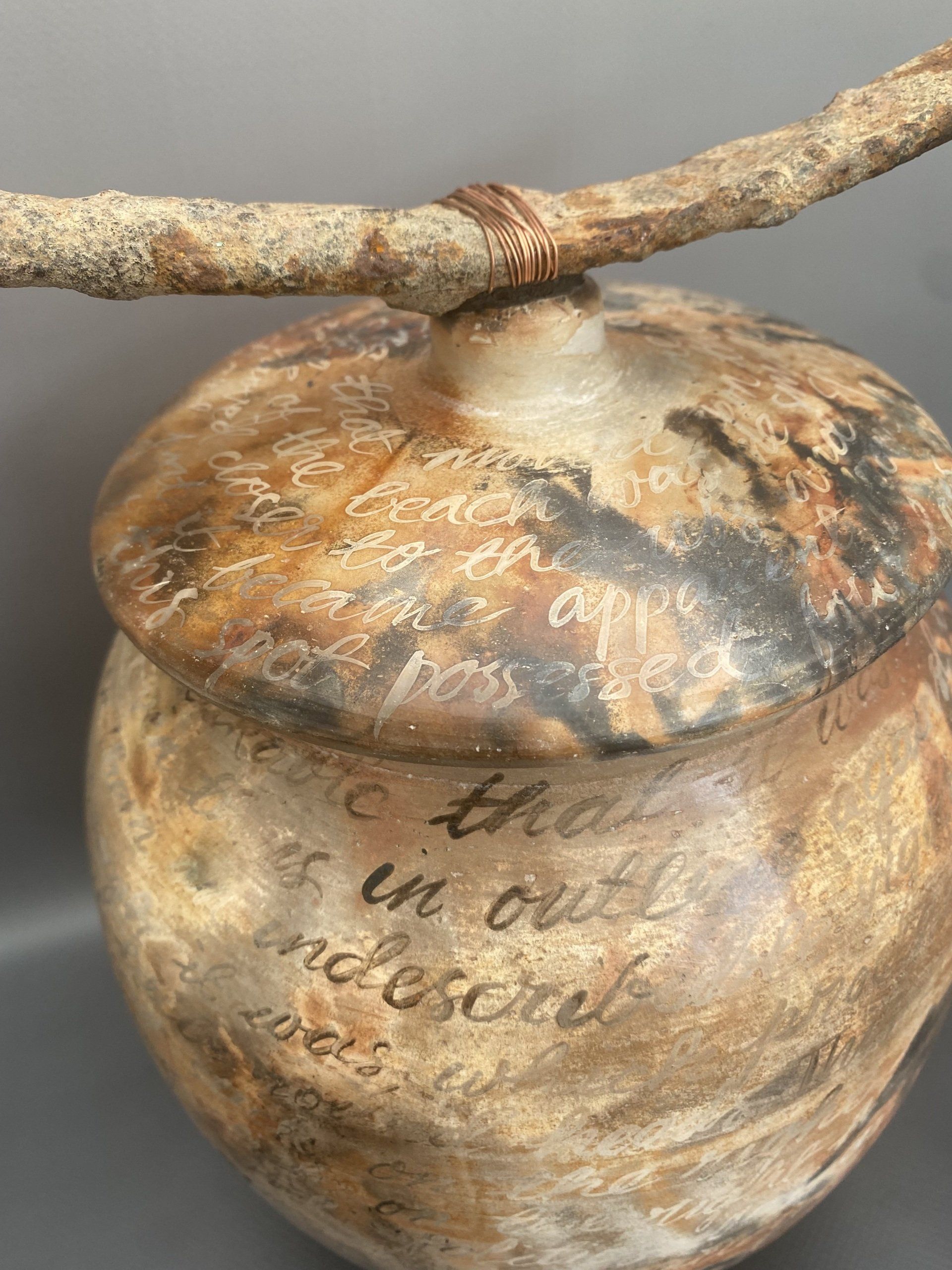 A passionate licensed mud larker, I often use the treasures that I find in my pieces. I love the stories that they hold, quietly lost on the foreshore of the Thames, I often use text on my smoke fired pieces, handwritten in ink and often lost, retained or resisted by the smoke. I hope this adds an air of mystery and history to the pieces.